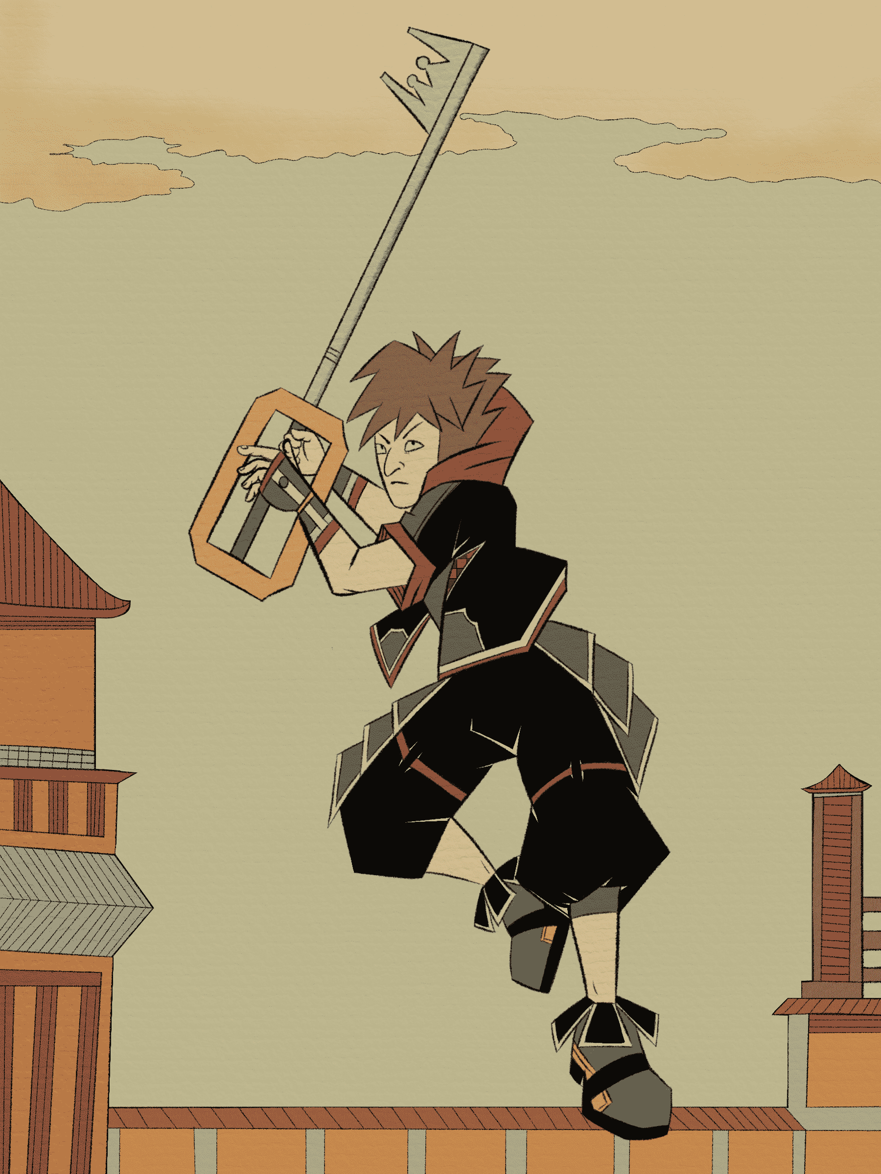 I adapted Sora from Kingdom Hearts into a traditional Japanese art style. I broke down the characteristics of both styles before starting work on the final image, giving it more authenticity. I added some texture to the piece instead of a cleaner digital appearance to mimic traditional media.
